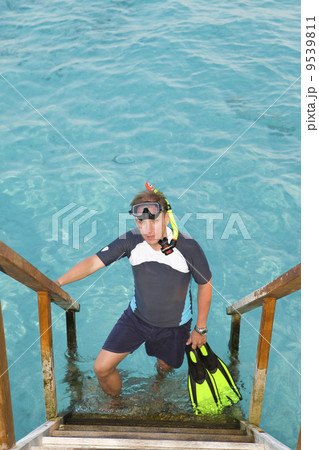 Man stands with equipment for Snorcel on steps of villa on piles on water. .Maldives...
