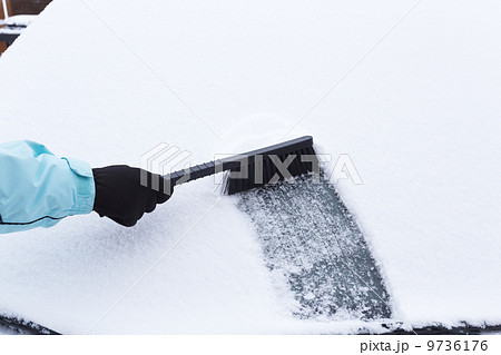 Woman cleaning snow from the car