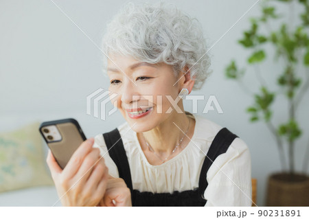 スマートフォンを操作する笑顔のシニア女性