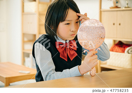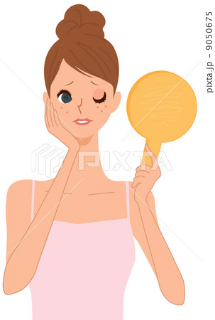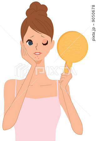 鏡を見てニキビを気にする10代の女の子 日本人女性