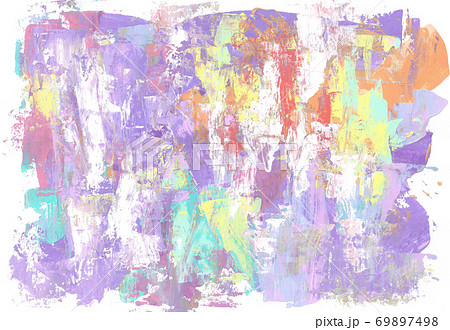紫と黄色とオレンジと赤と緑と白のアクリル絵具をパレットナイフで画用紙に描いた抽象イラスト。