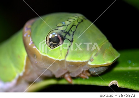 アゲハの終齢幼虫。脅しの目玉模様と本物の目。