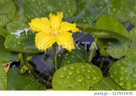 湖沼やため池に生息する水草のガガブタの花【ミツガシワ科アサザ属】