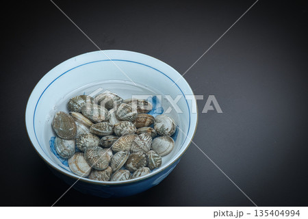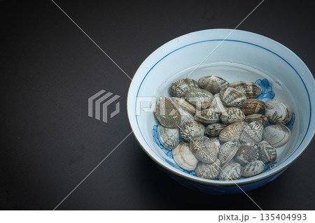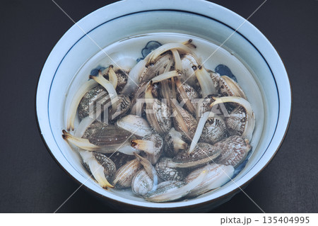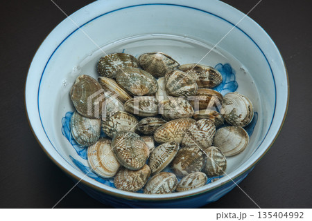 器の中に塩水と一緒に入れられた、砂抜き中のあさり