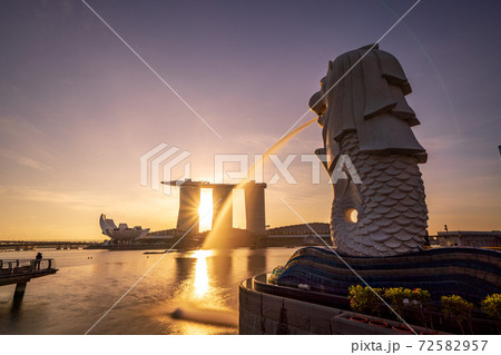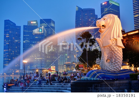 シンガポール マリーナベイの高層ビルとマーライオン