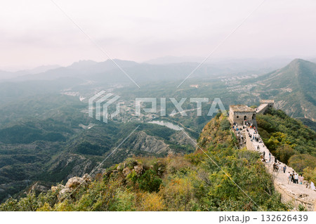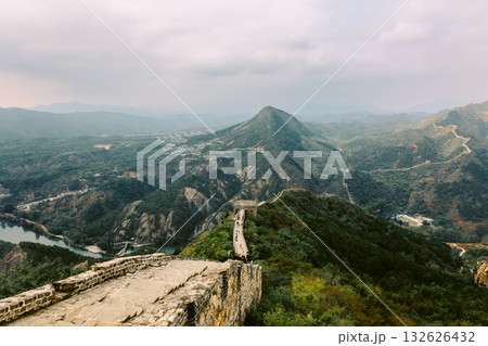 Aerial view of Simatai section of Great Wall of China in its original, un-restored state. Watchtowers perched on mountain peaks, Beijing, China. High quality photo