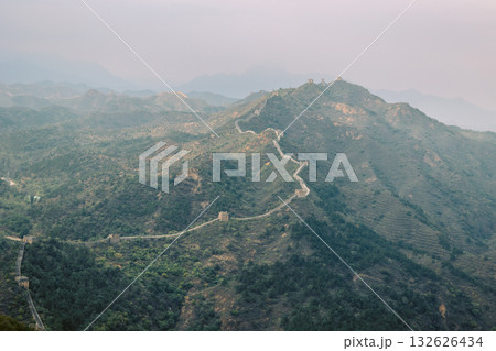 Aerial view of Simatai section of Great Wall of China in its original, un-restored state. Watchtowers perched on mountain peaks, Beijing, China. High quality photo