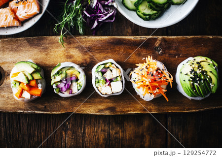 Colorful breakfast rolls filled with fresh vegetables, some topped with protein, arranged neatly on a wooden board. A light and healthy morning meal perfect for sharing