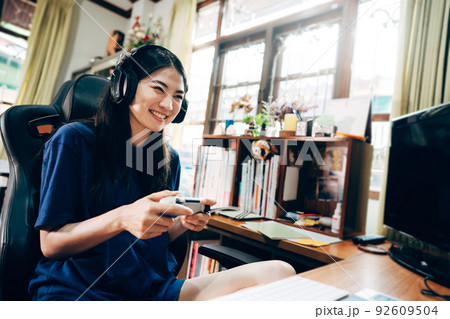 young asian woman enjoy her media gaming in the