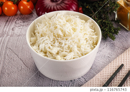 White raw rice in a ceramic bowl. Rice as an ingredient