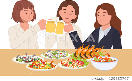 women celebrate together over beer and a variety of asian seafood dishes including shrimp platters and fresh salads