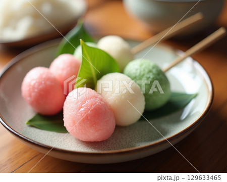 Bright Colorful Dango Japanese Mochi Rice Cake Dumplings with Skewer on Plate