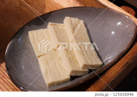 close up of uncooked raw tofu ( bean curd) cut in rectangle on a plate shape for hot pot