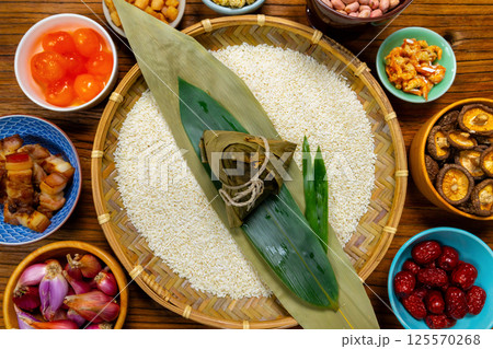 包裹好的粽子周圍擺放著各式各樣的粽子餡料