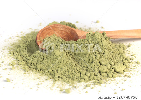 Japanese powdered matcha green tea on wooden spoon. Antioxidant, healthy, organic product. Beverages and nutrition. Isolated image on white background.