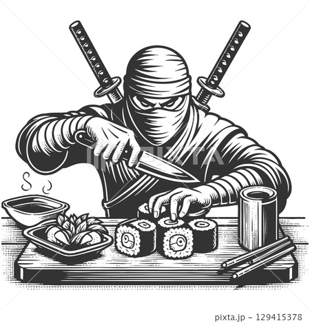 Ninja Chef Preparing Sushi Rolls engraving vector