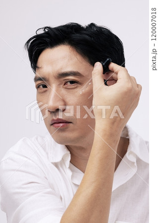 A middleaged man staring into the distance with foundation on his face