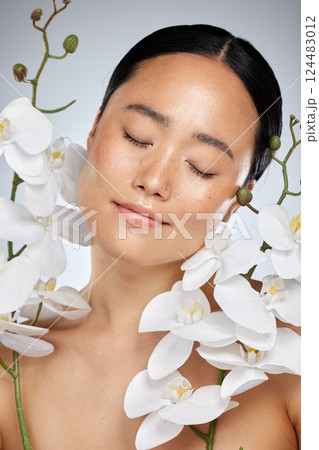 Asian woman, orchid flower and skincare on studio background in relax wellness, health and face. Portrait of smile and happy model in self care makeup with plant for soft and perfect skincare beauty