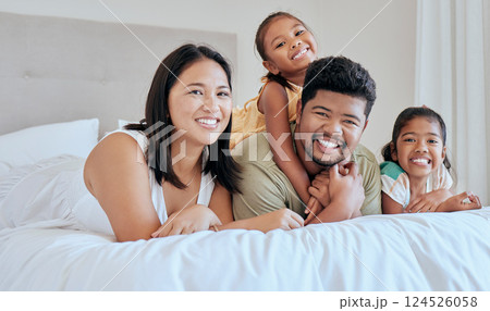 Happy, asian and family bedroom portrait together with smile, children and care in loving home. Happiness, relax and mother with father on bed for rest, bonding and leisure with young children.