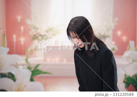 お葬式・お通夜で喪服を着て合掌をする若い女性