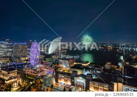 【都市風景】横浜開港祭の花火と横浜夜景の共演