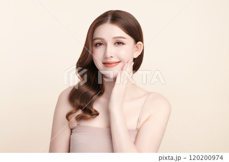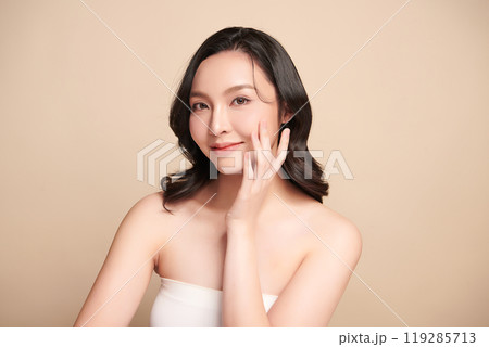 Beautiful young asian woman with clean fresh skin on beige background, Face care, Facial treatment, Cosmetology, beauty and spa, Asian women portrait.