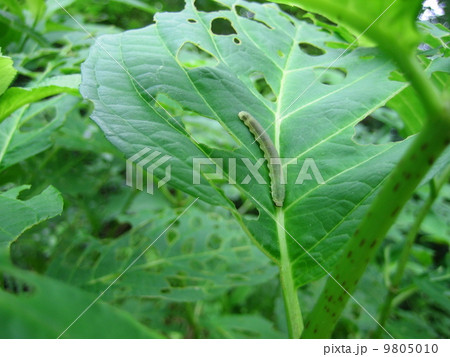 アジサイの葉を穴だらけにするアジサイハバチの幼虫 害虫被害