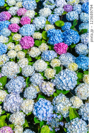 岩手県一関市舞川原沢 紫陽花の名所みちのくあじさい園 あじさい池を埋めるアジサイ水中花