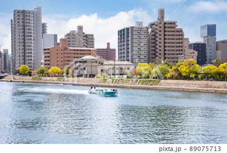 広島世界遺産航路の遊覧船風景です。アステールプラザ前を航行しています。明るい雰囲気をどうぞ。広島県
