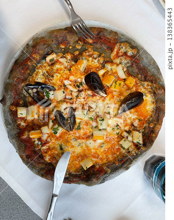 帆立とイカの魚介類が入ったトマトソースのパスタ【真俯瞰】