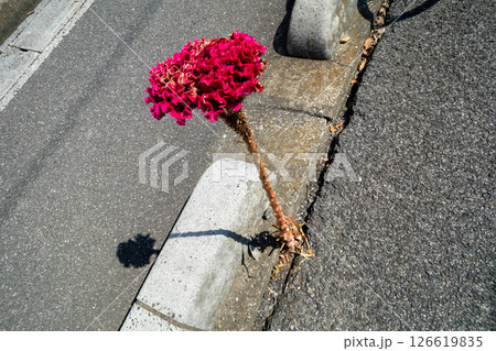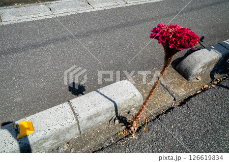 除草剤で枯らされた雑草の残骸を押し退けてアスファルト舗装された農道の真ん中に咲く鮮やかな黄色の花