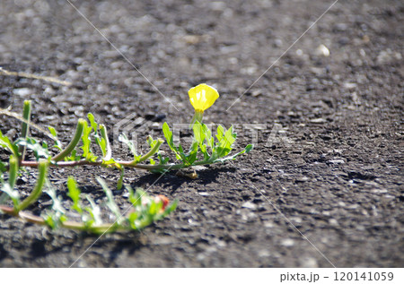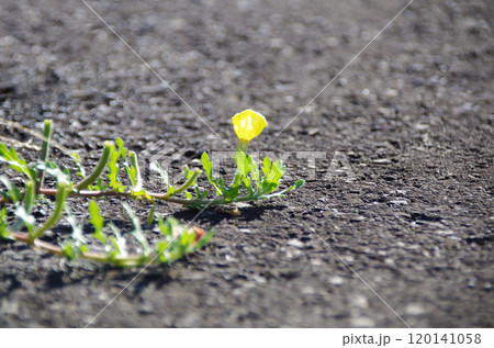 アスファルトの道の真ん中まで進出して咲く鮮やかな黄色の小さい花