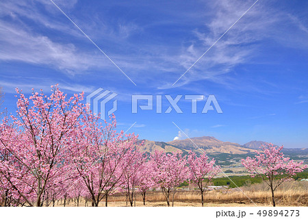 (阿蘇山・根子岳)青空を背景に映える河津桜風景(南阿蘇)熊本県野外劇場アスペクタ