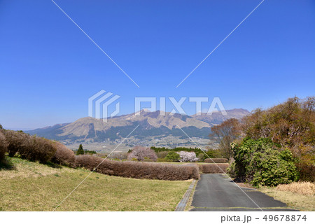 阿蘇山・阿蘇五岳全景を背景に最高に美しい春空と桜並木風景 日本 熊本県南阿蘇2020年春撮影
