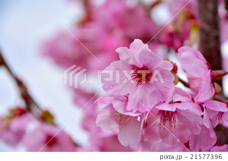 (阿蘇山)青空を背景に映える河津桜風景(南阿蘇)熊本県野外劇場アスペクタ
