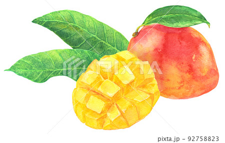 水彩マンゴー_カットマンゴーとマンゴー_葉つき2