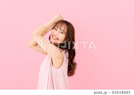Beautiful Young Asian woman Raises her hands to Showcase clean and hygienic underarms Against a white background, Smooth armpit cleanliness and protection concept