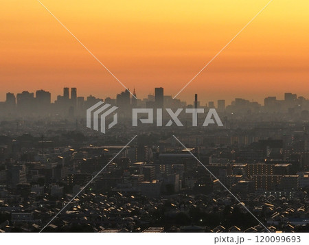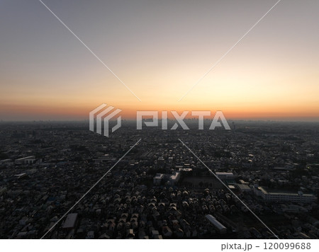 【都内・武蔵野上空から空撮】 都心に昇る朝日