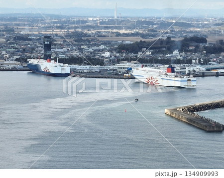 <空撮>大洗マリンタワーとさんふらわあ・ぴりか さんふらわあ・ふらの
