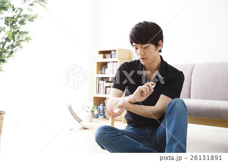 朝出勤前に手首に香水をつけるスーツ姿の若いアジア人ビジネスマン(メンズコロン・メンズ香水)