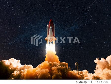 Shuttle spacecraft with ballast takes off into starry space. Successful rocket launch on the night sky with stars