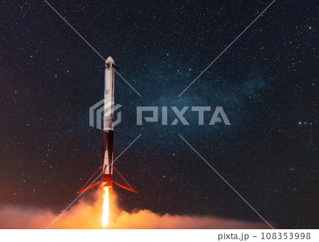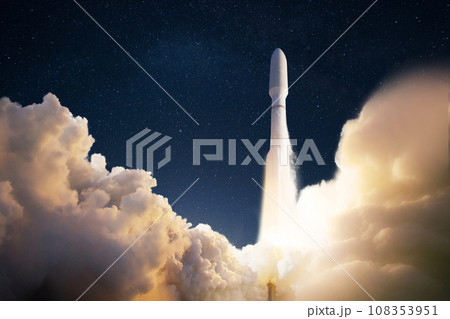 New space rocket with blast and smoke takes off into the starry sky. Technology, transport and science, creative idea. Start-up, concept. Spacecraft launch into space