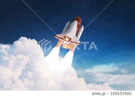 New Rocket flies to another planet. Spaceship takes off into the starry sky. Rocket starts into space. Concept. Spaceship shuttle lift off through the clouds.