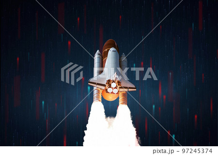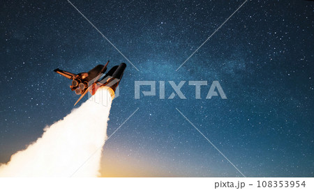 Space shuttle rocket lift off a mission in outer space with stars. Rocket flies on a starry background