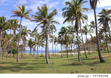 南米チリ沖の太平洋に浮かぶイースター島、ヤシの並木と太平洋が美しいアナケナ海岸