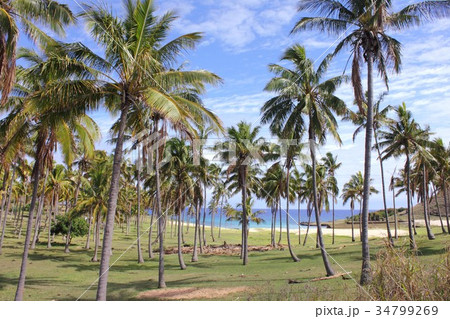 南米チリ沖の太平洋に浮かぶイースター島、ヤシの並木とコバルトブルーのウミガメ美しいアナケナの海岸