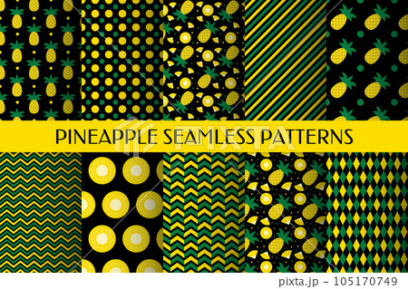 Set of 10 pineapple seamless patterns. Summer tropical fruit vector background bundle. Vector template for textile, fabric, wallpaper, wrapping paper, etc.