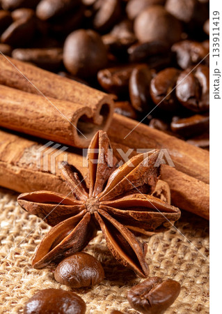 Artfully arranged coffee beans, anise, and cinnamon on rustic burlap napkin