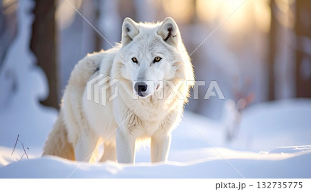雪の中に立つ白いホッキョクギツネ。柔らかな冬の光に包まれた美しい自然の姿