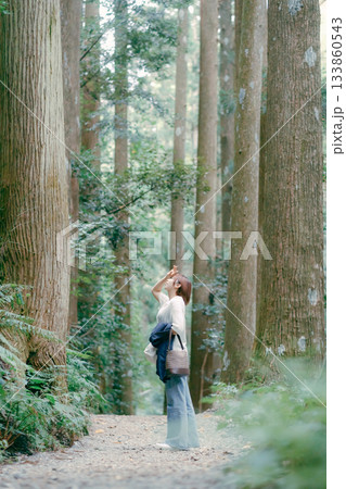 聖地巡礼で杉林を歩く女性